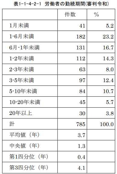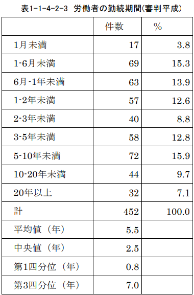 労働審判手続を利用する労働者の勤続期間は平成調査に比して令和調査では平均値が5.5年から3.7年へと大きく減少しています。労働者全体での勤続期間はほぼ横ばいですので、これは裁判所の門をくぐろうとする人の特性が長期勤務者から短期勤務者へと大きくシフトしたためと考えられます。