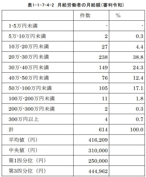 労働審判手続を利用する労働者の多数を占める月給労働者について、その月給額は以下のようになっています。