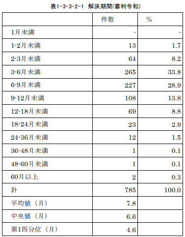 労働審判手続における解決期間(解雇などの紛争事案が発生してから審判により問題が解決するまでに要した期間)は中央値が6.6年、平均値が7.8年となっています。