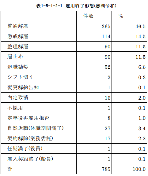 ここでいう雇用終了形態とは、整理解雇、懲戒解雇、普通解雇、雇止め等々といった、雇用終了の外形的な形態のことを指します。労働審判手続では普通解雇が46.5%、懲戒解雇が14.5%、整理解雇が11.5%となっています。