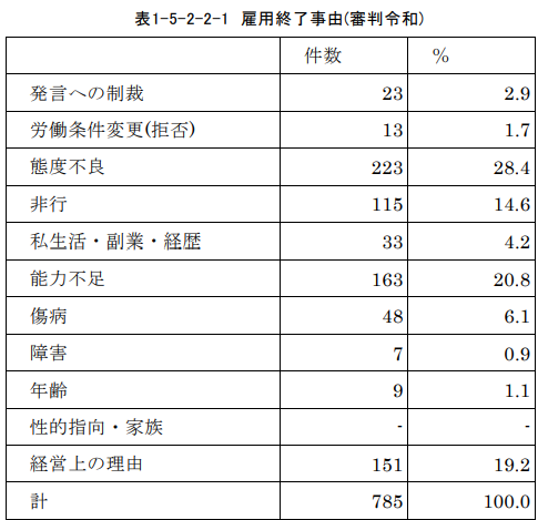 ここでいう雇用終了事由とは、使用者側がいかなる理由を挙げて解雇その他の雇用終了を正当化しているかを指します。態度不良や非行などの労働者の行為に基づくものが51.8%とほぼ半数を占め、能力不足や傷病など労働者の能力・属性に基づくものが28.9%と約3割、経営上の理由が19.2%と約2割を占めています。