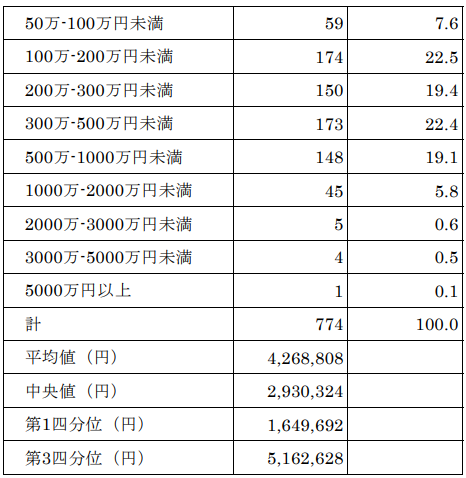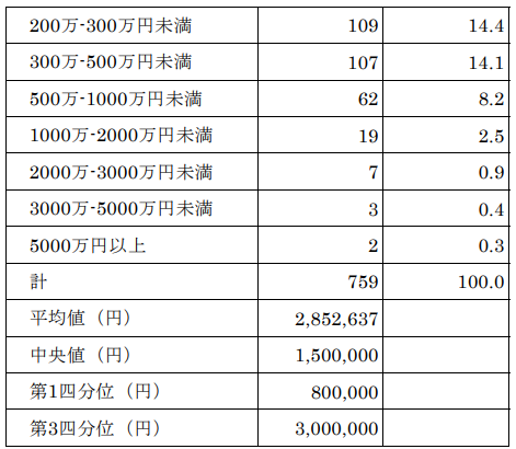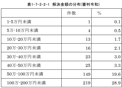 労働審判手続における解決金額は以下のようになっており、最多階層は100万-200万の層に分布しています。