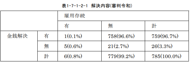 労働審判手続における解決内容について、雇用存続の有無と金銭解決の有無に大別すると、96%以上が雇用存続せずに金銭解決しており、これが圧倒的大部分を占めています。