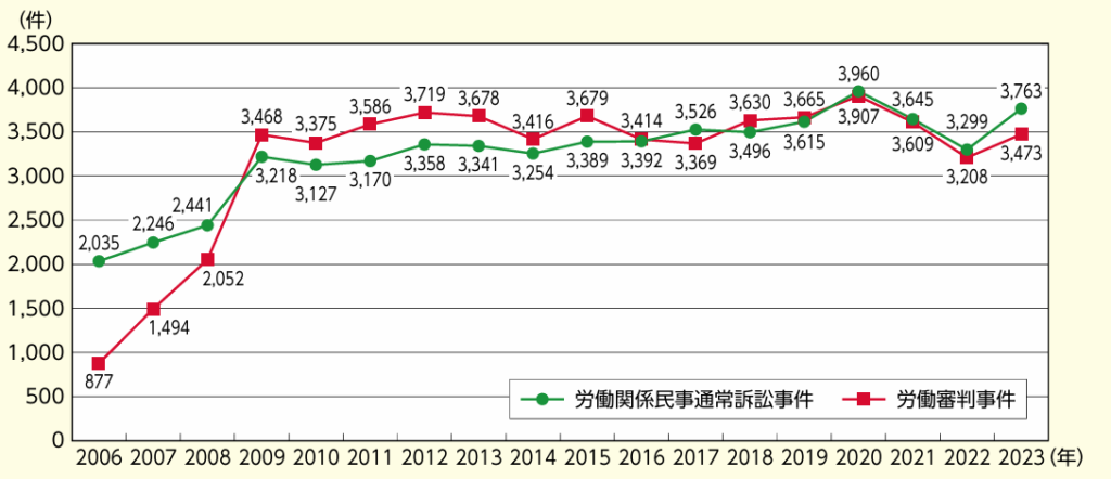 労働訴訟の事件数の推移は上表のようになっており、2009年頃まで続いた増加傾向が現在は横ばいとなっています。