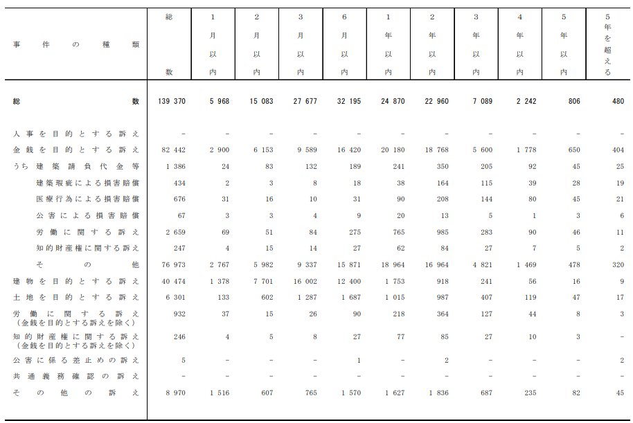 令和6年のデータでは、第一審での労働訴訟のうち、労働に関する訴え(金銭を目的とするもの)については全2659件あるうち、1月以内が69件、2月以内が51件、3月以内が84件、6月以内が275件、1年以内が765件、2年以内が985件、3年以内が283件、4年以内が90件、5年以内が46件、5年を超えるものが11件となっており、最多の層が1年以上2年以内のレンジであることがわかります。
