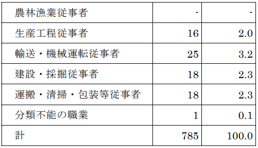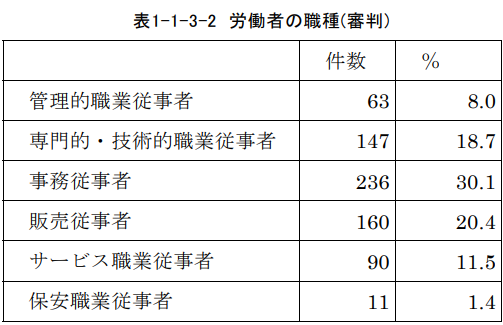 労働審判手続を利用する労働者においては事務従事者が最も多く、30.1%を占めます。これに続くのは販売従事者の20.4%です。次に続くのは専門的・技術的職業従事者(18.7%)、サービス職業従事者(11.5%)、管理的職業従事者(8.0%)となっており、上位5位までの職種はすべてホワイトカラー職種であって、ブルーカラー職種は極めて少なくなっています。