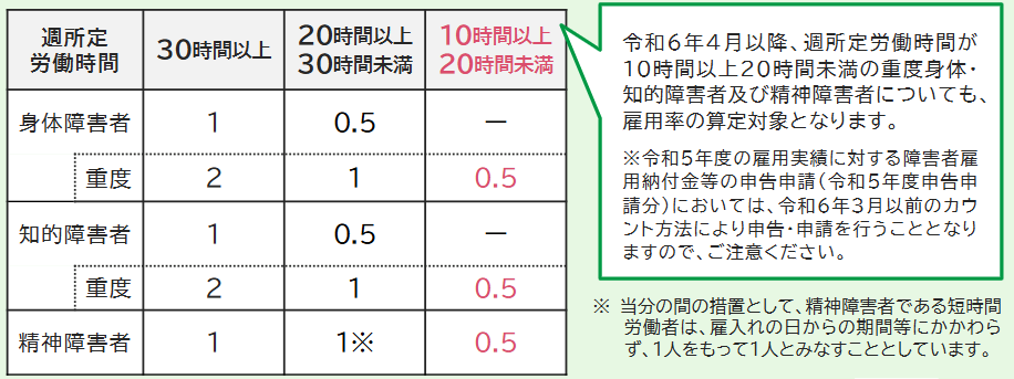 障害者雇用率制度や後述する障害者雇用納付金制度では、雇用する障害者の数を、下表のように算定します。