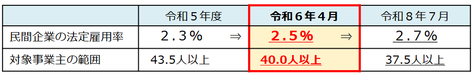 令和6年4月以降、以下の表のように段階的に法定雇用率が引き上げられます。