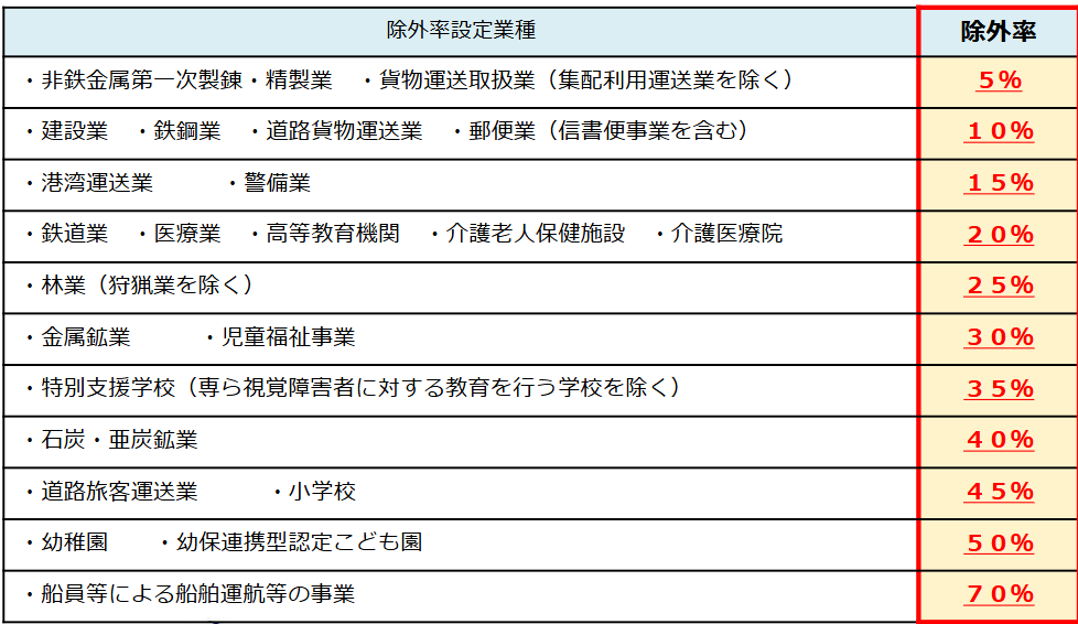 障害者を雇用することが困難であると認められる業種については、軽減措置として、法定雇用障害者数の算定にあたり常時雇用している労働者からその業種ごとに定められた一定の割合(除外率)の人数を除外することが認められているところ、除外率が、各除外率設定業種ごとにそれぞれ10ポイント引き下げられ、令和7年4月1日から以下のように変わりました。(これまで除外率が10%以下であった業種は除外率制度の対象外となりました。)