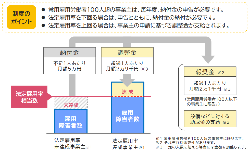 障害者の雇用に関する事業主の社会連帯の責務を果たさせるべく、法定雇用率を満たしていない事業主(納付金の徴収は常時雇用労働者100人超に事業主に限ります。)から納付金を徴収する一方、障害者を多く雇用している事業主に対しては調整金、報奨金や各種の助成金が支給されています。これを「障害者雇用納付金制度」といいます。