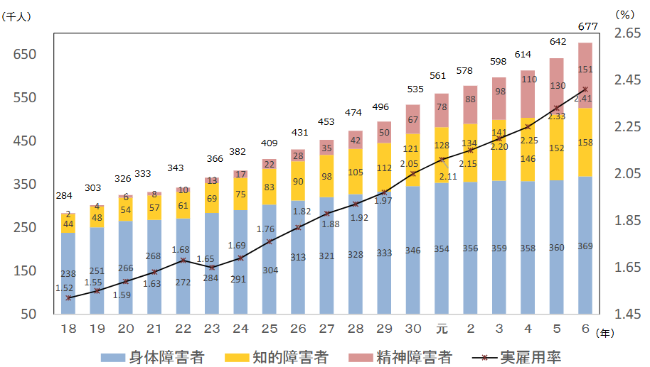 民間企業に雇用されている障害者の数は67.7万人となり、21年連続で過去最高を更新し、障害者雇用は着実に進展しています。実雇用率(常用雇用労働者に占める、障害者である労働者の数)は2.41%、障害者雇用率達成企業割合は46.0%となっています。(令和6年6月1日現在)